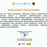 Dengan Ini Kami Segenap Pegawai Balai Kekarantinaan Kesehatan Kelas I Padang Menyatakan Sanggup Menyelenggarakan Pelayanan Sesuai Standar Pelayanan Yang Telah Ditetapkan; Memberikan Pelayanan Sesuai Dengan Kewajiban Dan Akan Melakukan Perbaikan Secara Terus Menerus; Dan Apabila Tidak Menepati Janji Ini, Kami Siap Menerima Sanksi Sesuai Peraturan Perundang-Undangan Yang Berlaku”